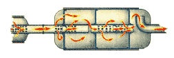 Отработавшие газы двигателя через входной патрубок поступают в первую камеру глушителя, где расширяются и теряют часть своей кинетической и акустической энергии. В следующей камере, с большим диаметром, этот процесс повторяется. Отраженная от торцевой стенки волна компенсирует дискретные выхлопы отработанных газов из двигателя автомобиля, что снижает уровень шума до того же значения, которое обеспечивается штатными глушителями автомобиля.